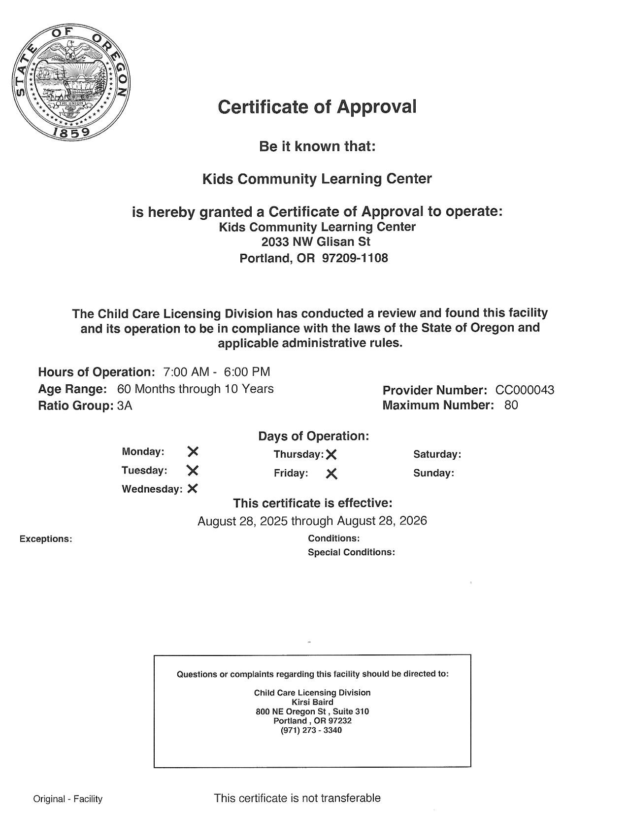 Kids Community Learning Center’s mission, activities, and finances are overseen by a Board of Directors. The Board is made up of individuals who are interested in the education and care of children and primarily consists of parents who have a child participation in a KCLC program. Kids Community Learning Center’s policies, governing documents and financial statements are available upon request.